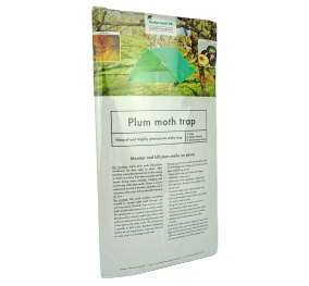 The product: The pack contains everything needed to monitor plum moth through one growing season. The sticky trap contains a plum moth specific pheromone lure to attract moths. This pheromone is a natural scent produced by female moths to attract a male mate. Once adult moths are attracted to the trap, they become stuck in the glue on the sticky insert. The pheromone is specific to plum moth, therefore minimising catches of non-target insects. One trap will cover an area of up to 5 average sized trees with a range of 15m.